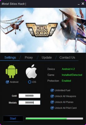 Взлом для Metal Skies(Стальное небо) даст вам бесконечное количество золота и медалей. Теперь вы можете приобрести самый лучший самолет даже на первом уровне, покупайте дополнительные предметы и бонус, которые продаются за реальные деньги. Теперь вам об это не нужно думать, просто погрузитесь в игровой процесс и получайте удовольствие.
