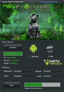 Чит-приложение для взлома Эволюция: Битва за Утопию позволит без усилий получить нужный запас денег, ресурсов и кристаллов, при помощи которых игрок повышает уровень, побеждает в боях и приобретает в игровом магазине разные полезности. Улучшение персонажа тоже затрачивает много ресурсов, а добыть их не так легко. Поэтому чит для Эволюция: Битва за Утопию будет необходимым дополнением для тех игроков, не желающих топтаться на одном месте и ждать накопления ресурса, а жаждущих ускоренного развития своего персонажа и прохождения в целом.