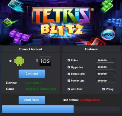 Взлом на Tetris Blitz даст вам 99999999 монет. Скачиваете, устанавливаете - наслаждаетесь шикарной игрой на новом уровне. Чит содержит новейшую защиту. Вы не получите бан или еще что-либо. Вы только представьте как вы громите все что попадается под "прицел" и ничего при этом не расходуя. Скачал чит на Tetris Blitz, установил - победил!