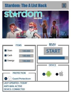 Взлом на Stardom: The A-List дает возможность герою не только всегда быть полным сил, но и быстрее набирать популярность. Взлом Stardom: The A-List позволяет мгновенно получать звезды, честным путем которые зарабатывать долго и скучно. Чит не содержит в своем коде вирусных фрагментов и обладает встроенной защитой от бана, поэтому использование этой программы абсолютно безопасно.