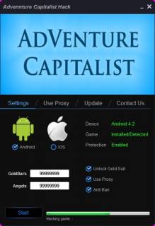 Взлом для Adventure Capitalist позволит участникам не только получить огромное множество золотых слитков для развития бизнеса, но и поможет привлечь вышеупомянутых инвесторов-ангелочков. А встроенный в чит анти-бан надёжно защитит от блокировки в игре.