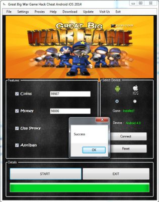 Взлом Great Big War Game обеспечит вас безграничными покупками для себя и своего войска. Таким образом, ты сможешь играть без потерь. Твоё войско будет обмундировано на совершенном уровне, ты обеспечишь его наилучшим оружием, при таких условиях победа будет принадлежать тебе. Этот чит Great Big War Game реально даёт уйму золота и денег. Устанавливается просто, подходит к любому устройству и гарантирует высшую безопасность игры.